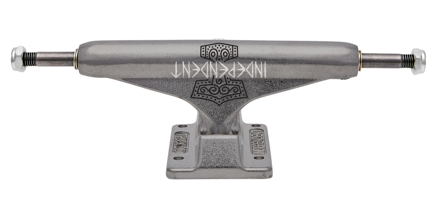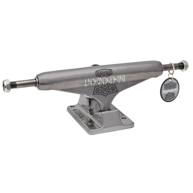 Independent Truck Company Kevin Baekkel Pro Stage 11 Hollow featuring transparent black powder coated hanger and baseplate, laser etched Independent logo and printed Norweigian mythological hammer tattoo art by Kevin's friend Hans Heggum with matching metal keychain hangtag, lasered Baekkel logo, silver hardware, and orange cushions.