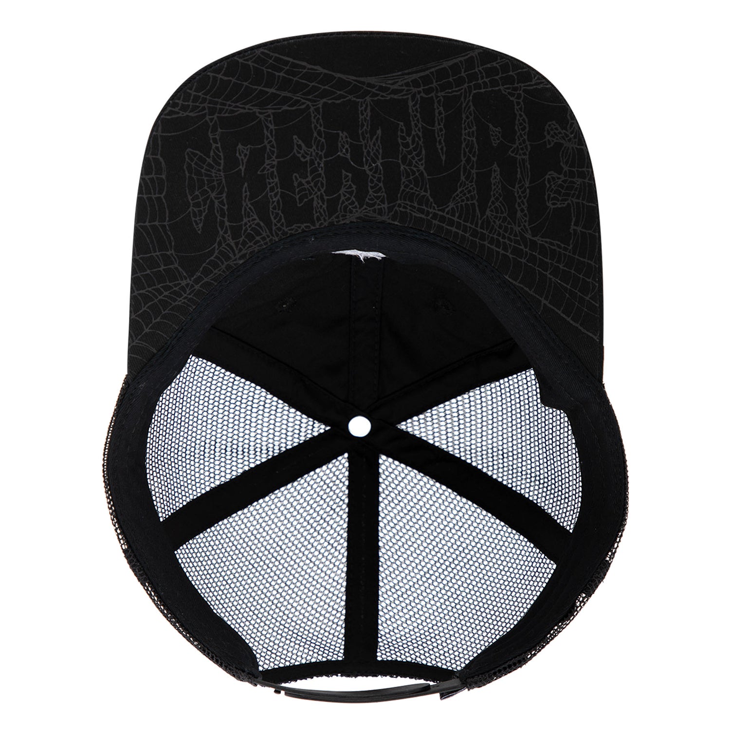 The Creature Bonehead Flame Wash low-profile fit, 6 panel structured mesh trucker snapback hat features direct embroidery, loop label at rear adjuster, custom under bill print and custom interior taping.