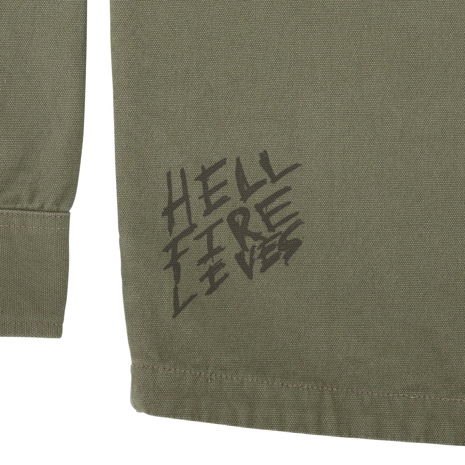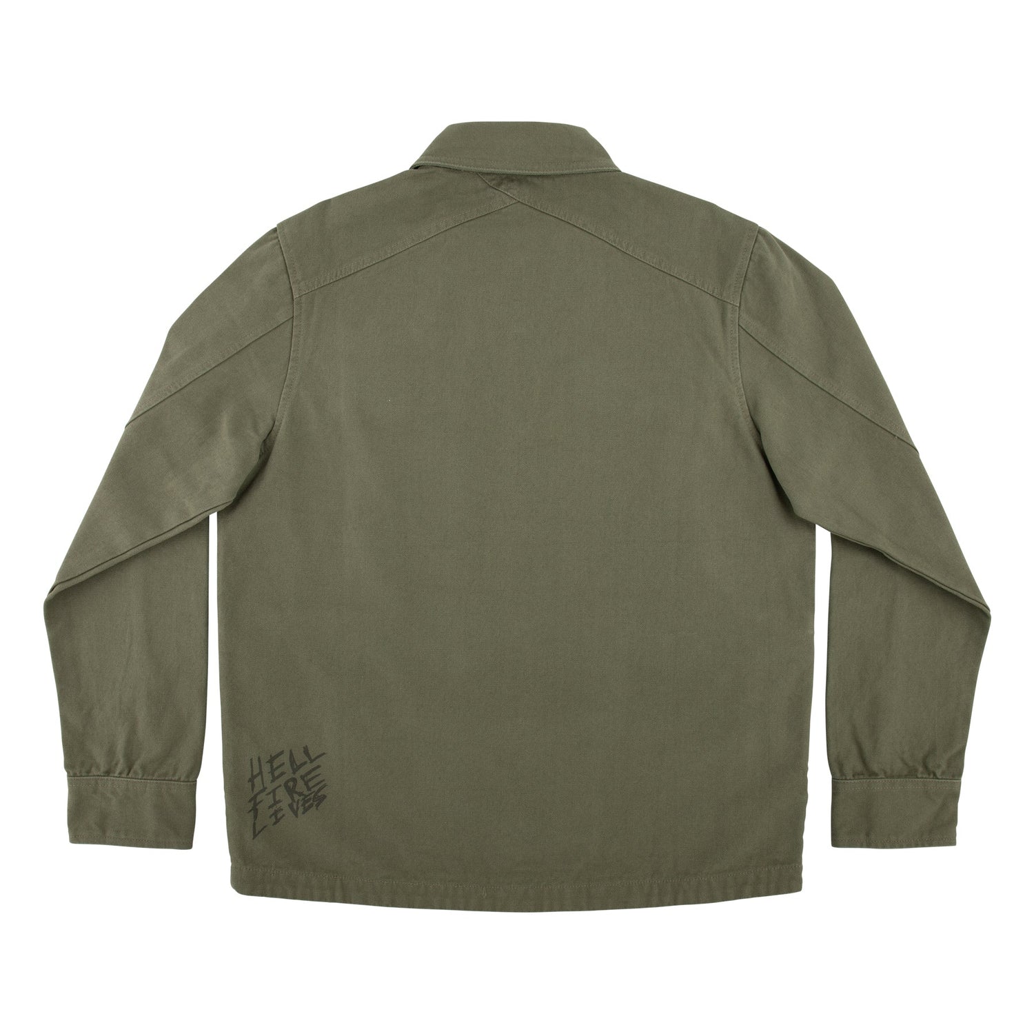 The Santa Cruz Stranger Things Crawl men's regular fit, midweight canvas army jacket features snap front closure, snap adjustable cuffs, 2 chest patch pockets, chest pocket D ring keyloop, chest Santa Cruz / Stranger Things changeable hook and loop patches, changeable sleeve Stranger Things hook and loop embroidered patches, 2 slash hand pockets, Large interior woven Hellfire Club label, Small Hellfire Lives screenprint on back left body.