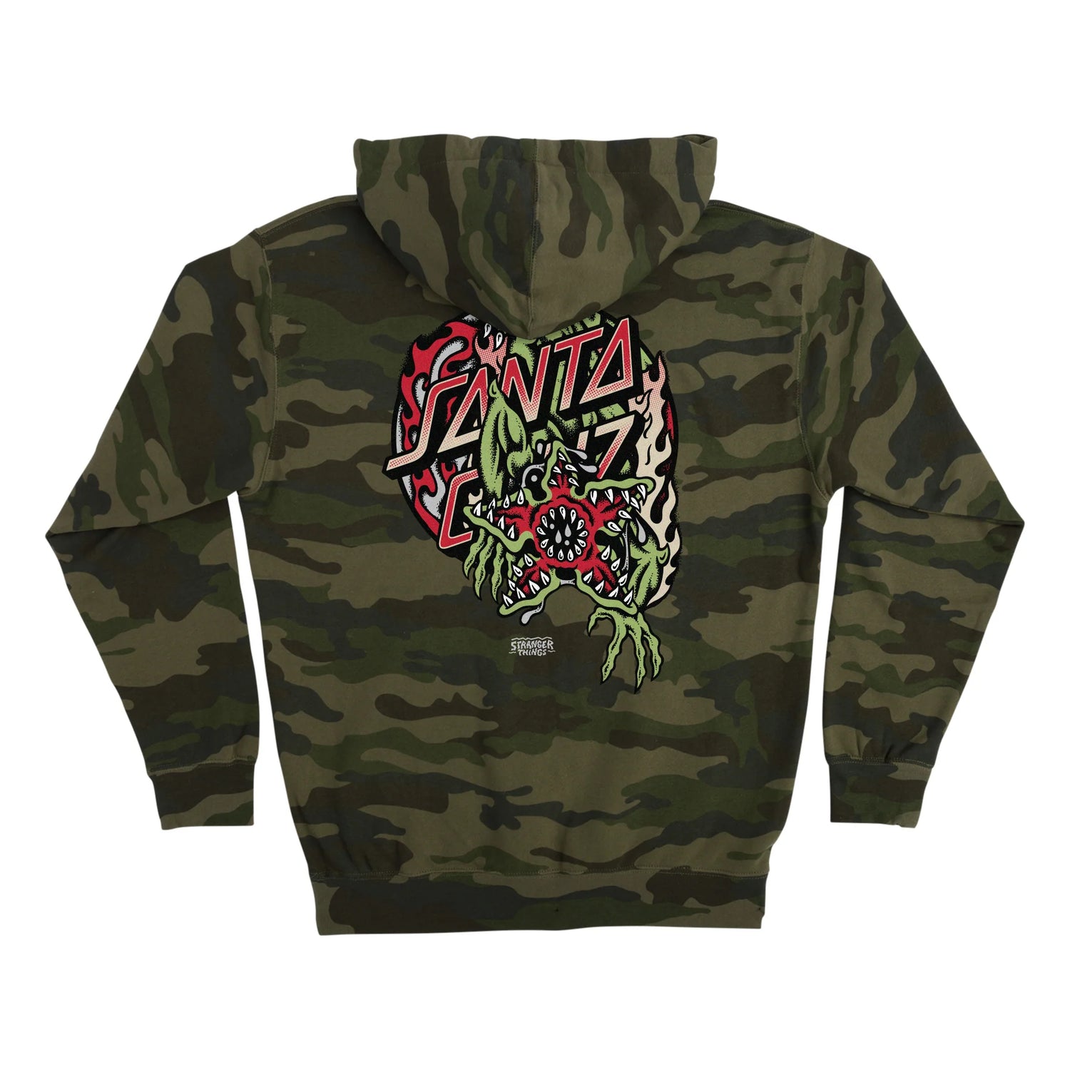 The Santa Cruz Stranger Things Demogorgon Dot men's heavyweight fleece hooded pullover sweatshirt features small front and large back Santa Cruz Stranger Things Demogorgon Dot artwork in soft hand ink.