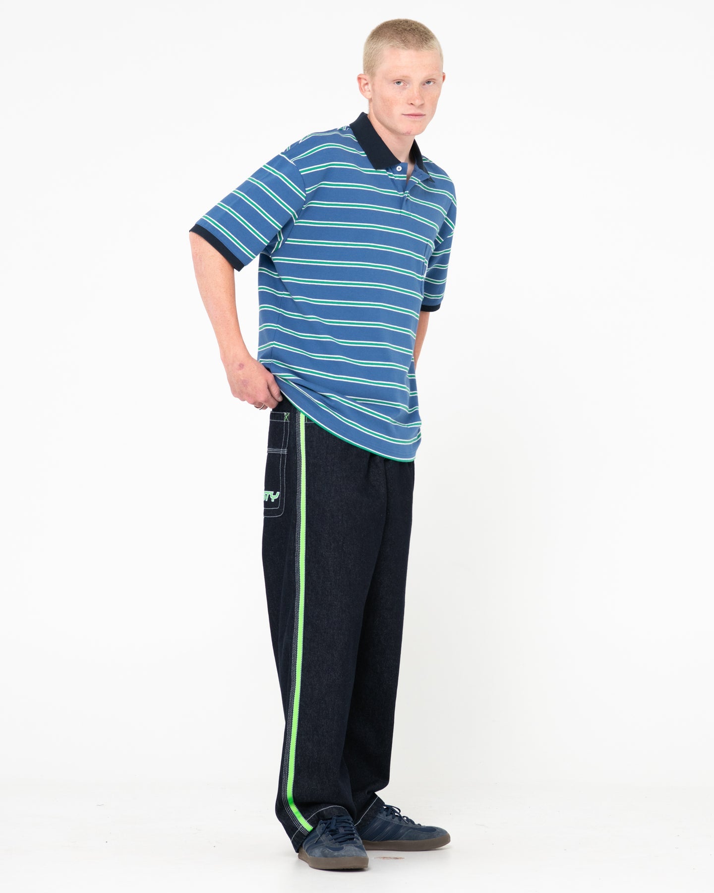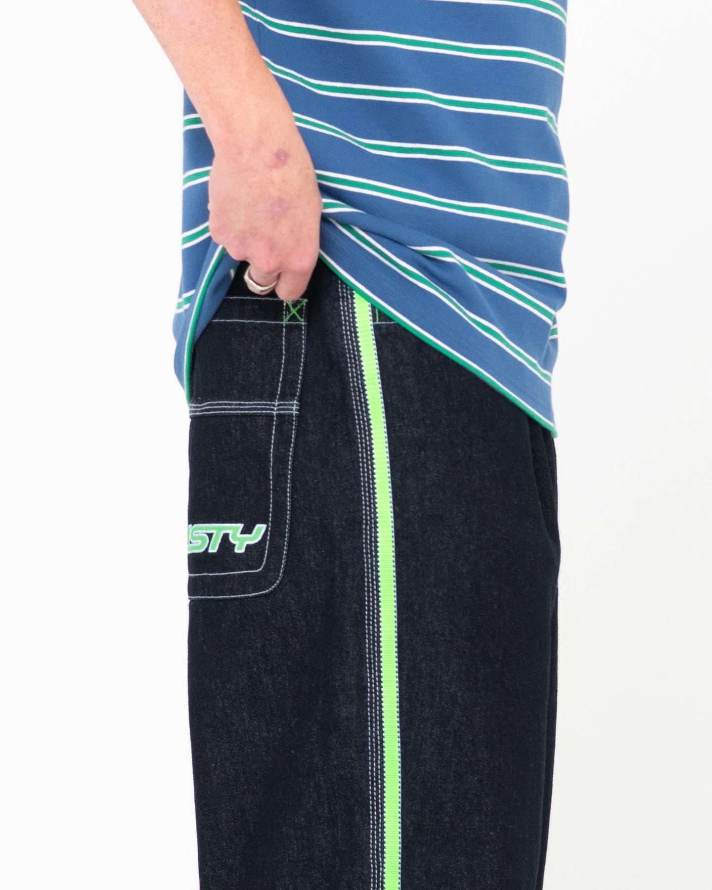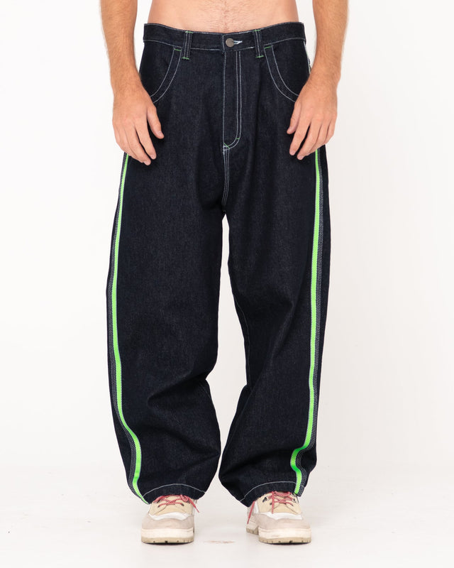 The Flip Daddy Jean features a baggy fit with acid green taping and Rusty embroidery. Shown in Raw Dog Blue/Green.