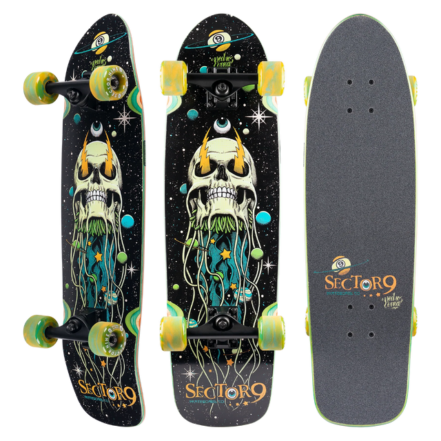 Our newest featured artist is primed to take us on a journey to the blackness of space, and the horrors that awaits. We’re stoked to introduce our latest artist collection from Brazilian illustrator, Pedro Correa. His work can be found in everything from magazines, to gig posters, to museum galleries, and now gracing his own Sector 9 collection. We’ve chosen Pedro’s super detailed visions of terror from the depths of outer space in his signature, muted color palette for a well-rounded quiver of shapes in the Chop Hop, Fractal and Dropper. The blackness of ocean depths meets the blackness of uncharted space in these all new anxiety-inducing graphics. Makes us wonder what’s really out there!